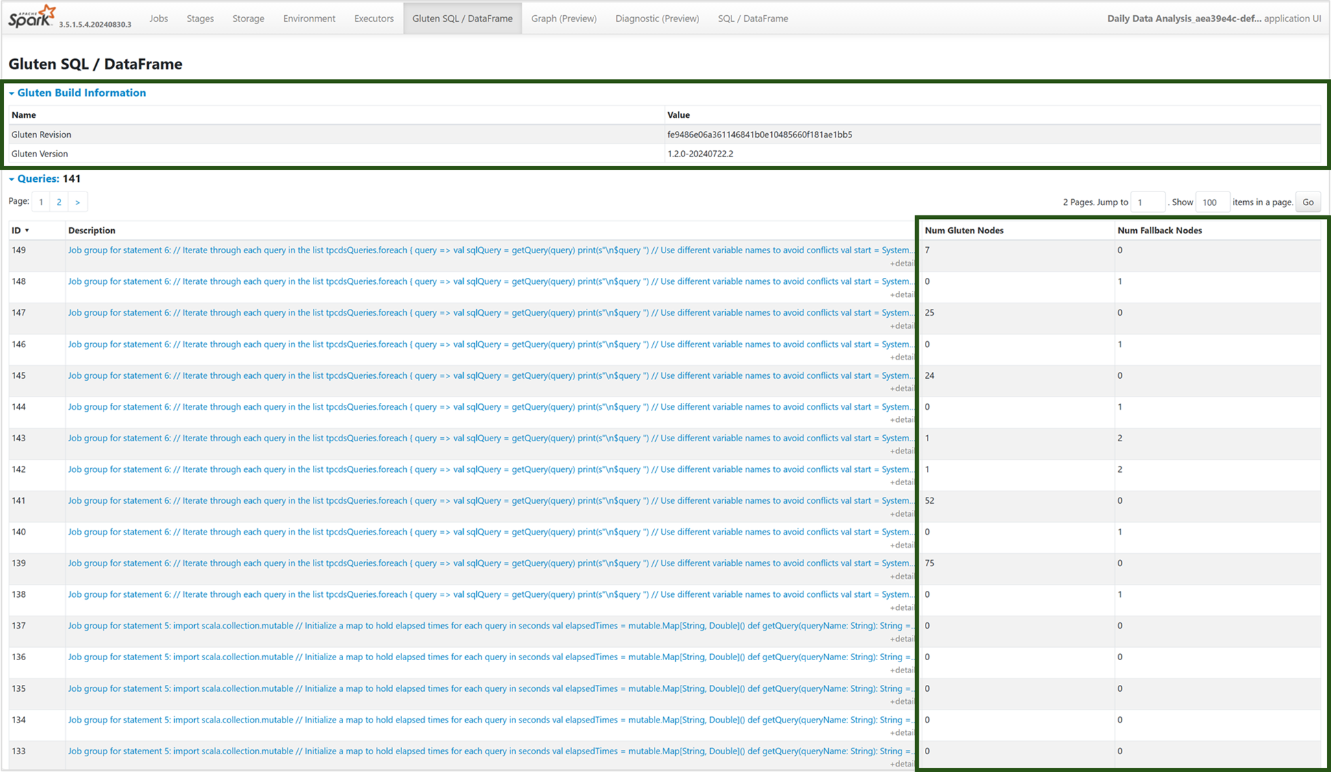 新しい [Gluten SQL/ DataFrame] タブに移動すると、Gluten のビルド情報とクエリ実行の詳細を表示できます。 [クエリ] テーブルには、ネイティブ エンジンで実行されているノードの数と、クエリごとに JVM にフォールバックするノードの数に関する分析情報が表示されます。