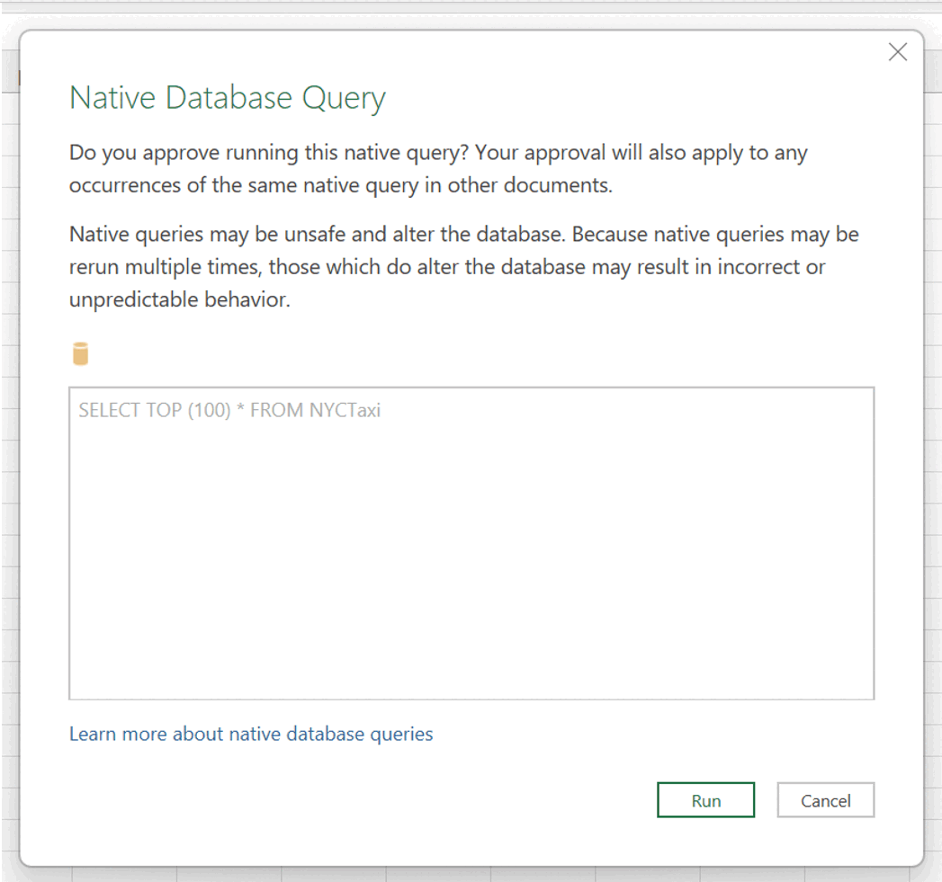 データを表示するには、[保護されているビュー] リボンの [編集を有効にする] ボタンを選んでから、[セキュリティ警告] リボンの [コンテンツの有効化] ボタンを選びます。 両方を有効にすると、表示されたクエリの実行を承認するための次のダイアログが表示されます。