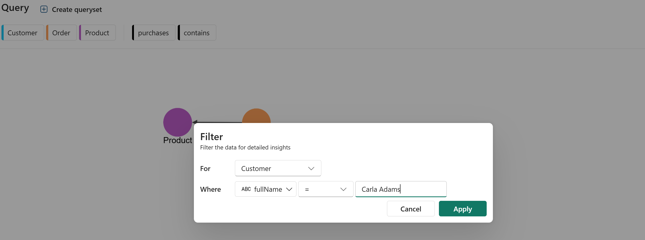 "特定の顧客が購入した製品は何か" という質問に答えるクエリを作成します。このクエリは、顧客から Order から Product までのグラフを走査します。 たとえば、顧客の Carla Adams の購入を照会するには、次の手順に従います。