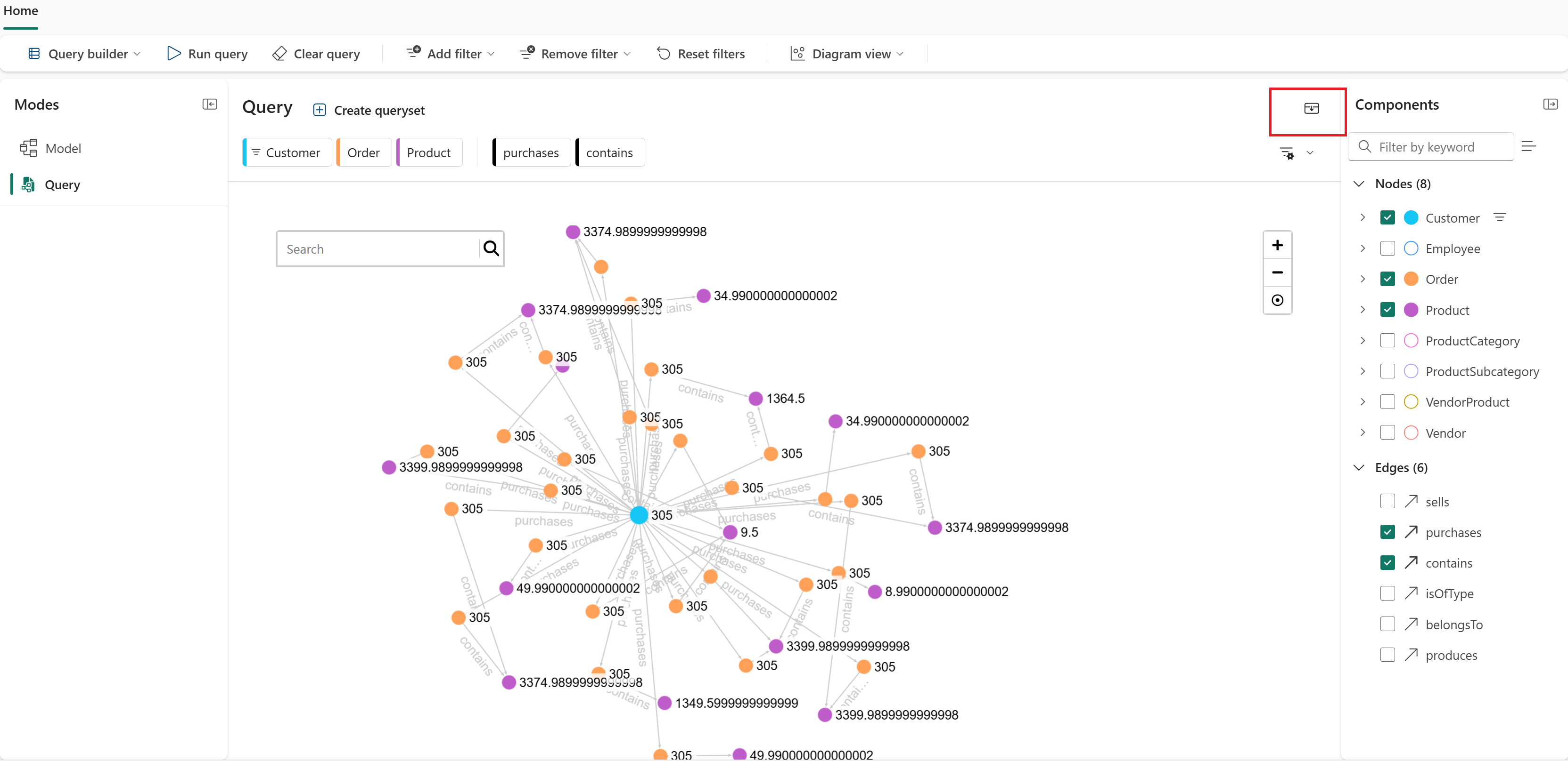 顧客ノードが選択されている間、 購入 エッジを選択します。 クエリ ビルダーは、接続された Order ノードを自動的に追加します。