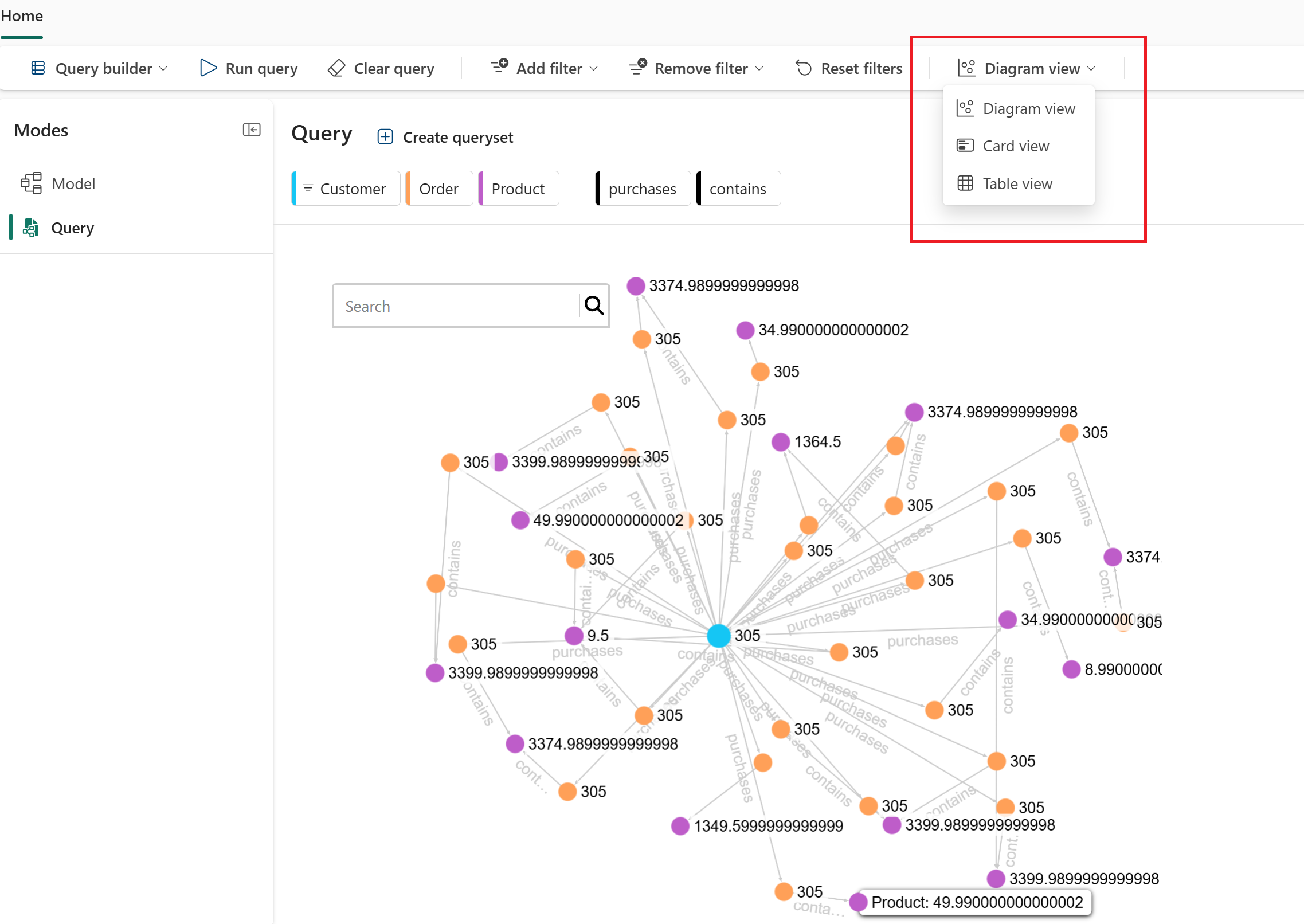 - ダイアグラム ビュー: グラフの構造とリレーションシップを視覚化します。 このビューが既定です。