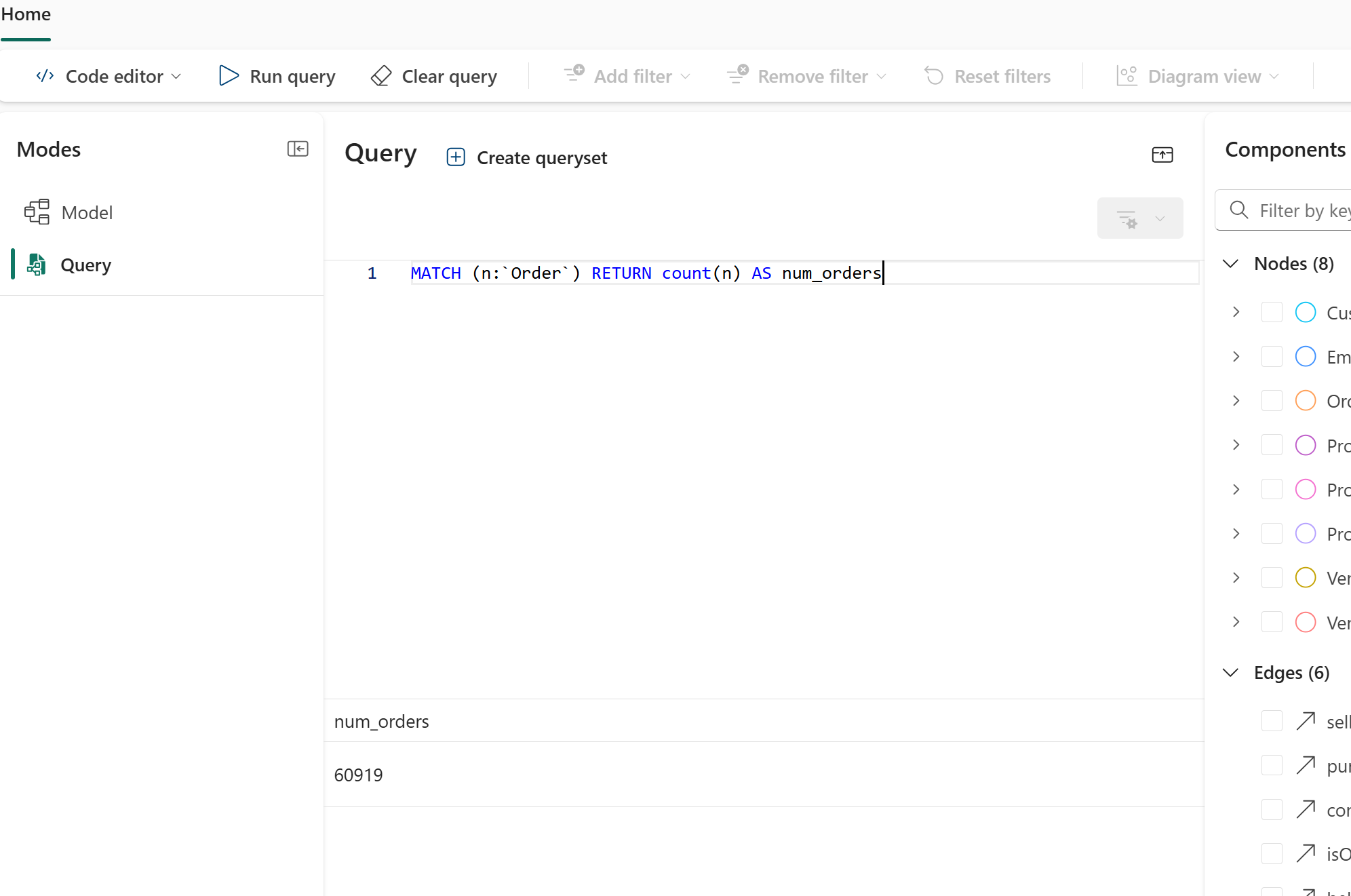 MATCH (n:`Order`) RETURN count(n) AS num_orders[ クエリの実行 ] を選択してクエリを実行します。