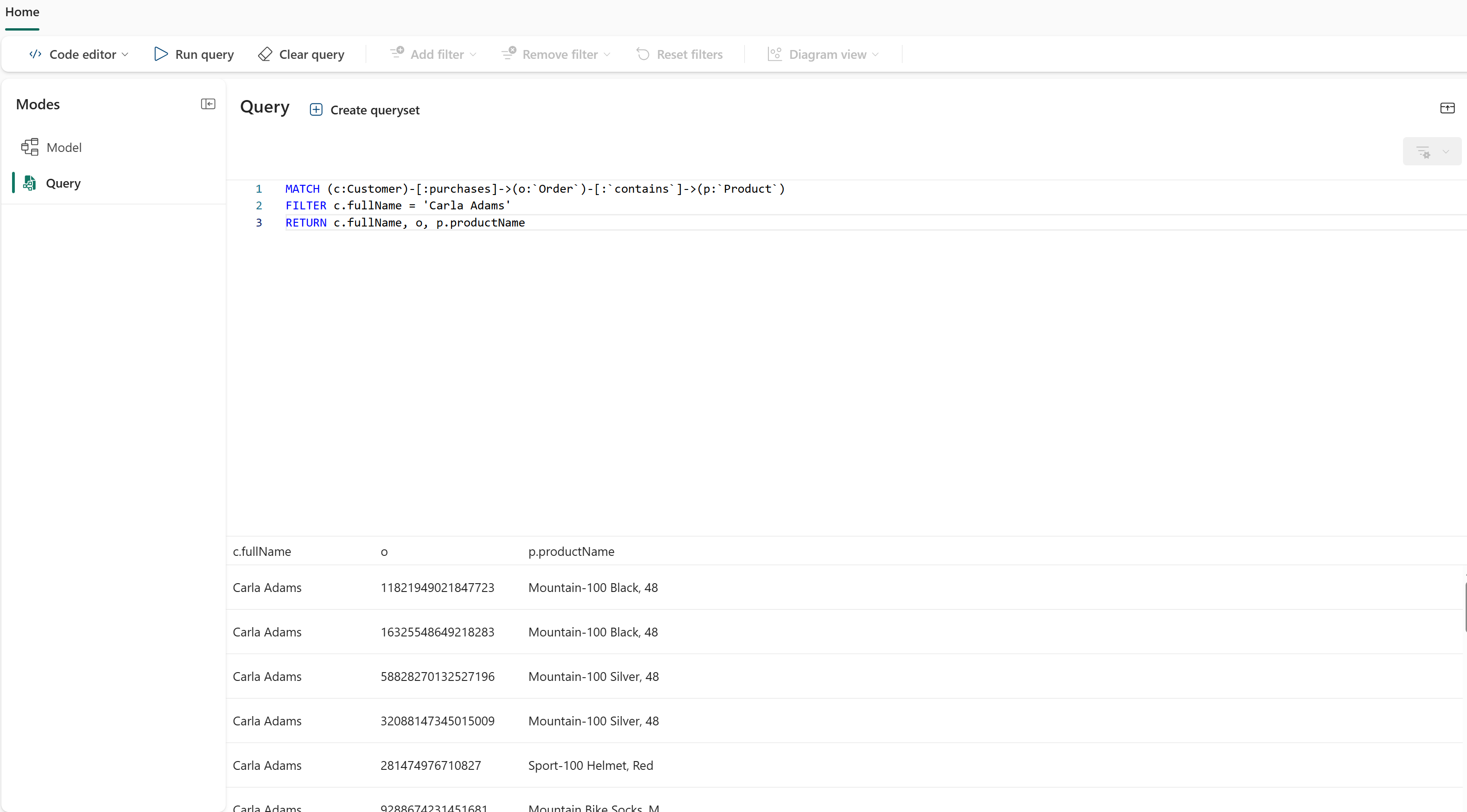 前の チュートリアルの手順では、クエリ ビルダーを使用して、特定の顧客が購入した製品を検索しました。 GQL で記述されたのと同じクエリを次に示します。