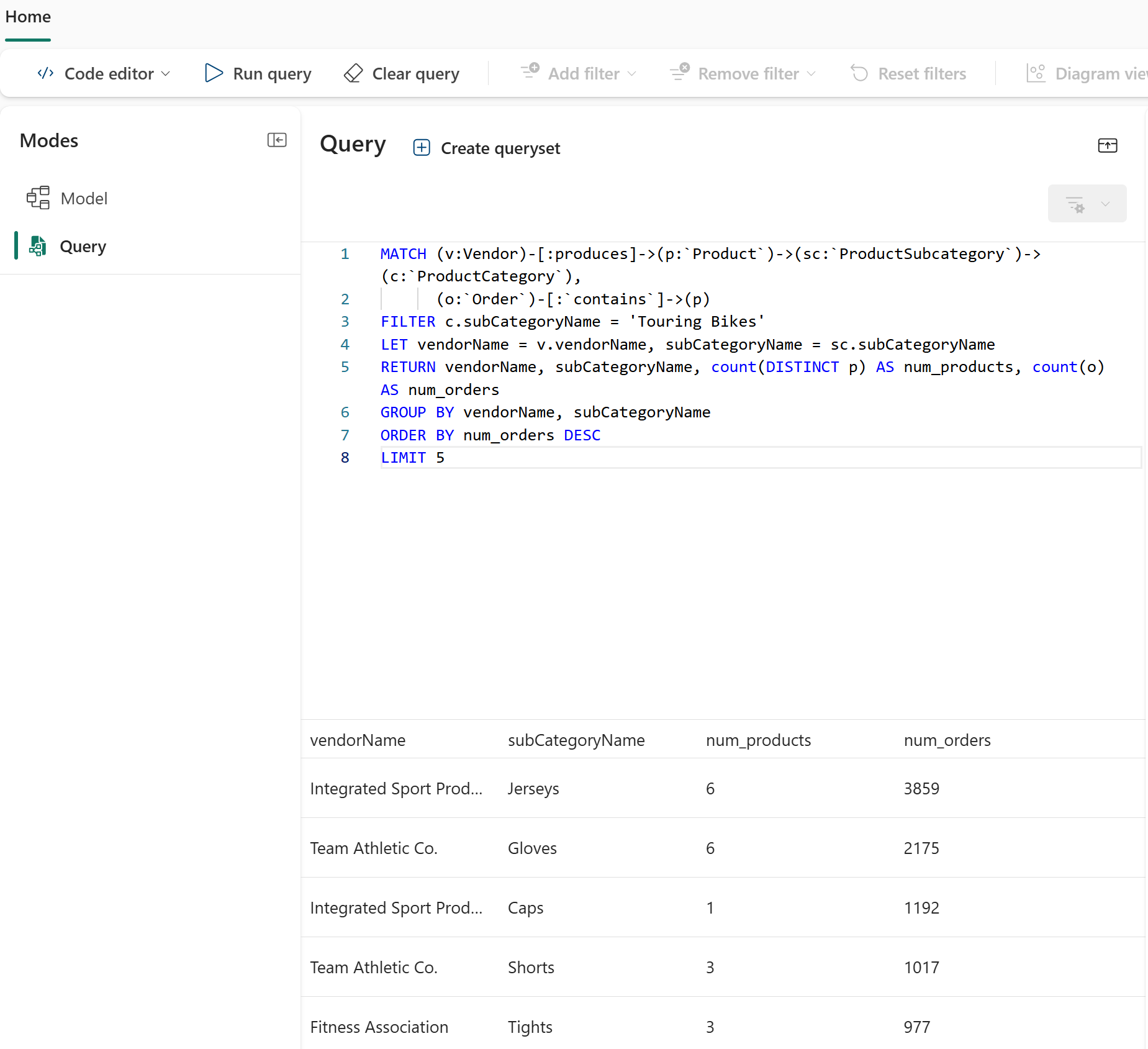 このチュートリアルの手順では、コード エディターで GQL (Graph クエリ言語) を使用してグラフのクエリを実行します。 GQL は、複雑なグラフ パターンと分析のための強力なクエリ機能を提供します。