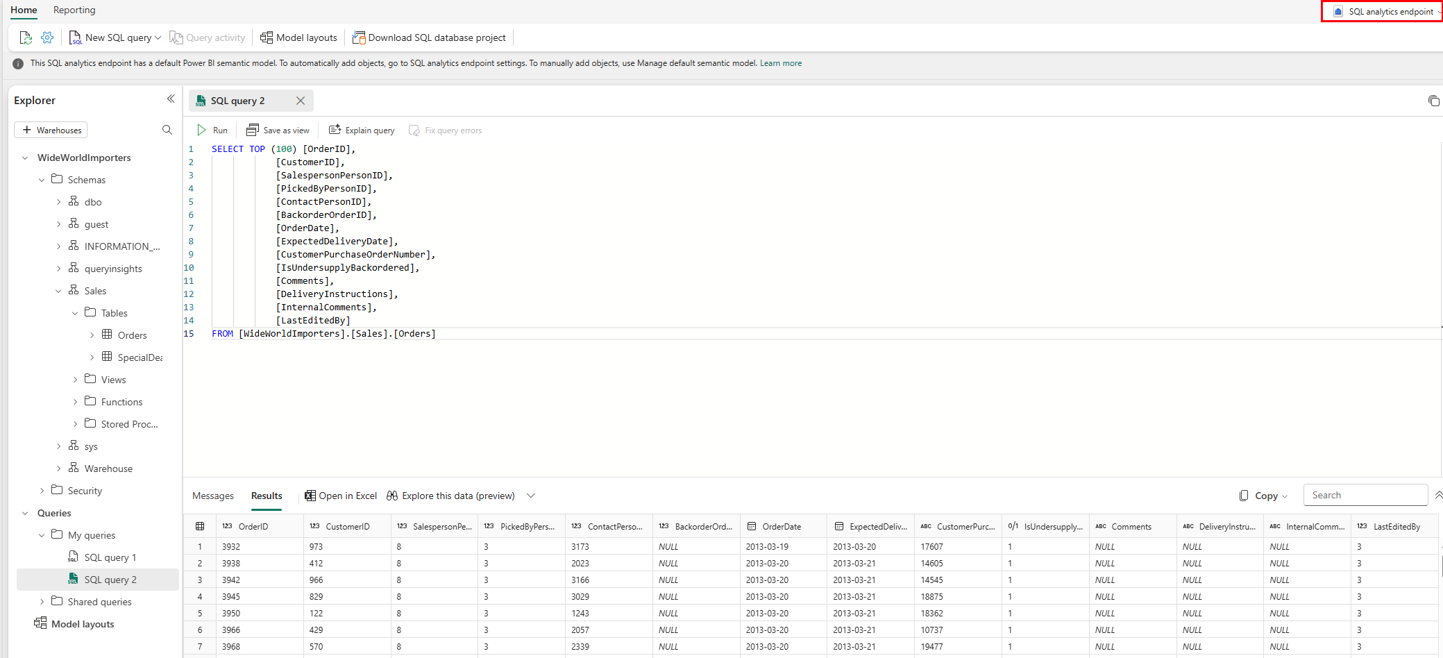 SQL 分析エンドポイントを使用してミラー化されたSQL Server データベース内のデータに対するクエリのスクリーンショット。