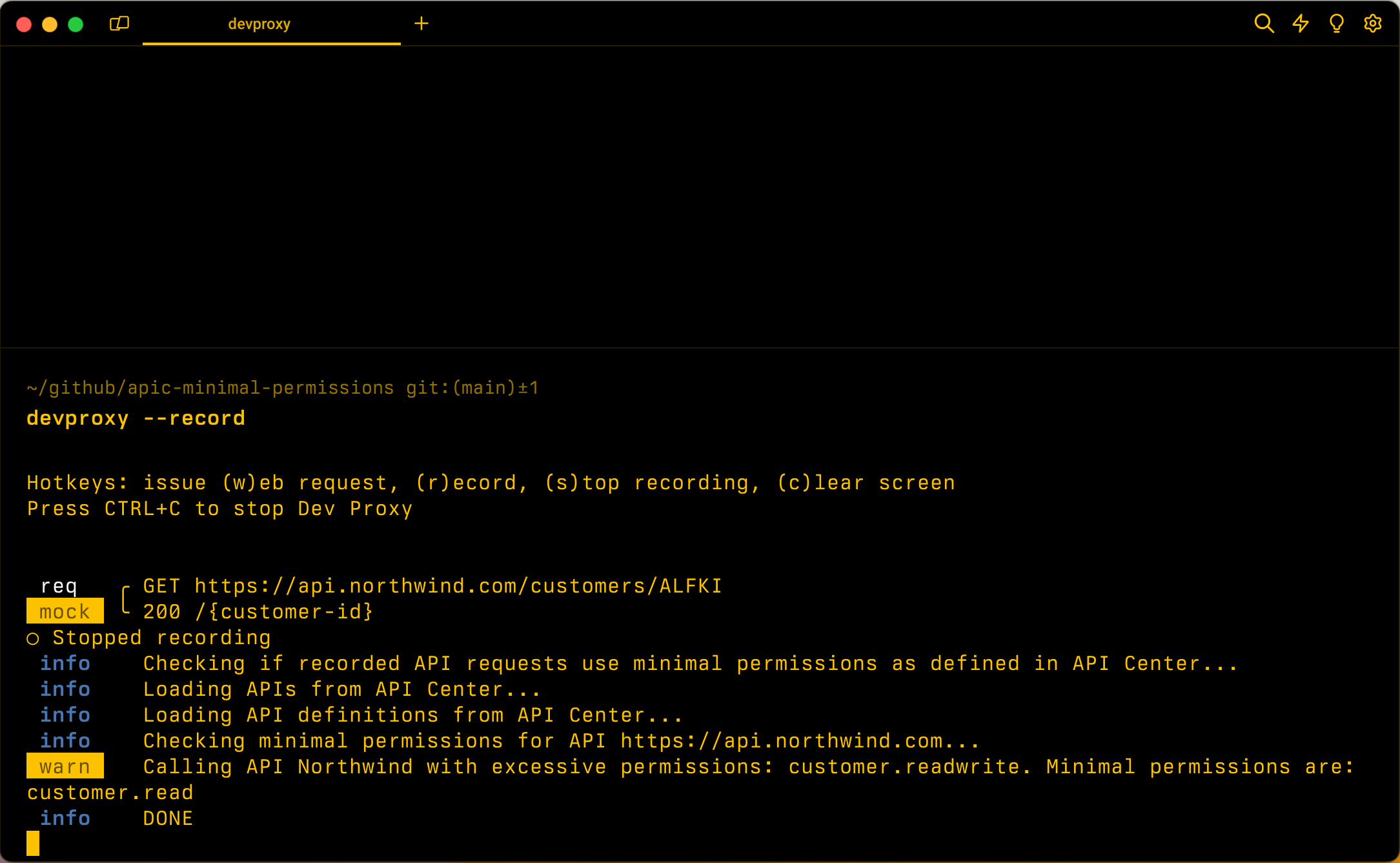 s キーを押して記録を停止します。 Dev Proxy が API Center インスタンスに接続して、要求に関する情報を API Center からの情報と比較します。