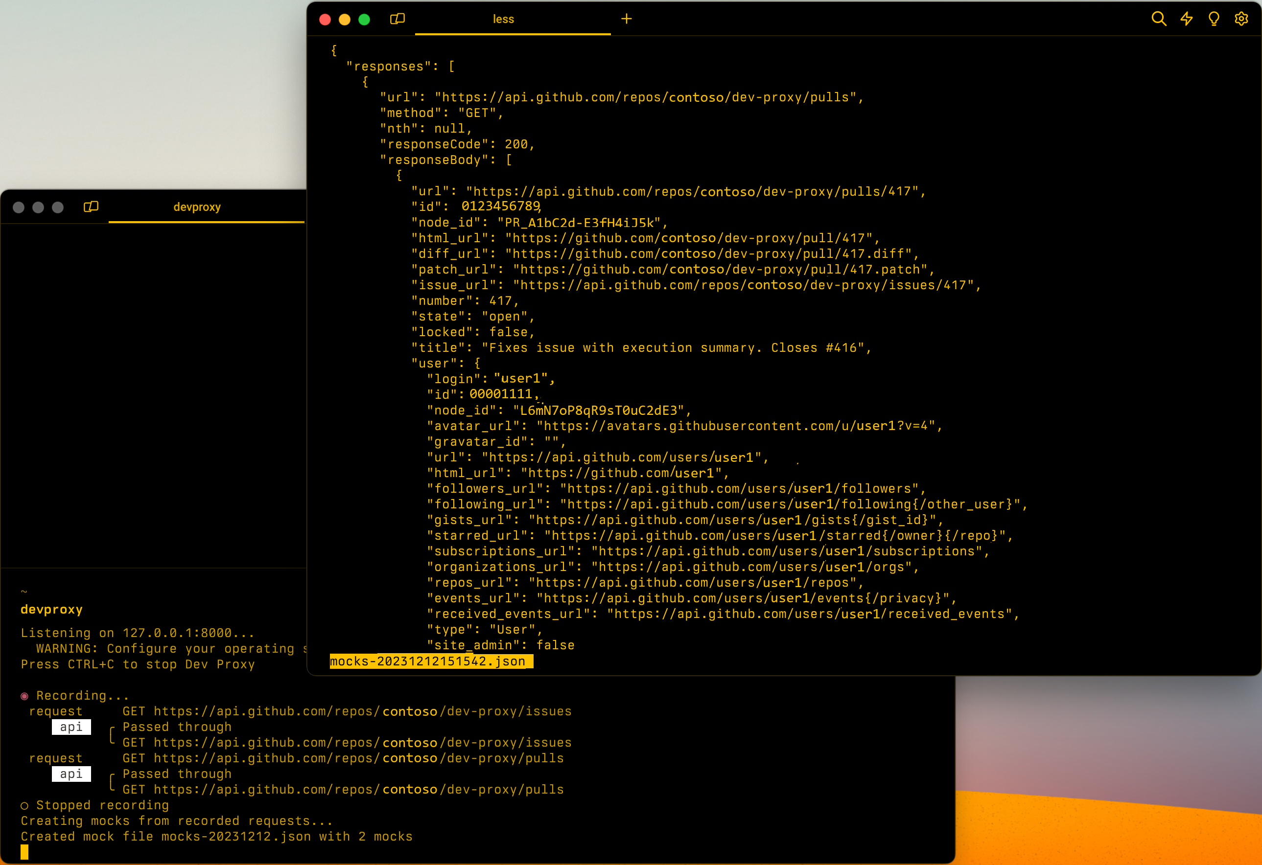 要求をインターセプトするには、開発プロキシを開始した後、の記録開始します。 完了したら、記録を停止します。 開発プロキシは、インターセプトされた要求のモックを生成し、現在の作業フォルダー内の mocks-yyyyMMddHHmmss.json という名前のファイルに書き込みます。