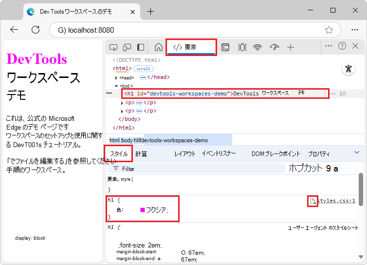 styles.css] を選択してエディター ウィンドウで開きます。h1要素のcolorプロパティは、fuchsiaに設定されます。