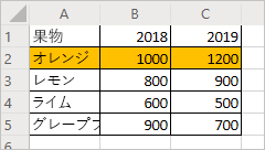セル A2:C2 ("オレンジ" 行) を選択し、塗りつぶしの色をオレンジ色に設定します。