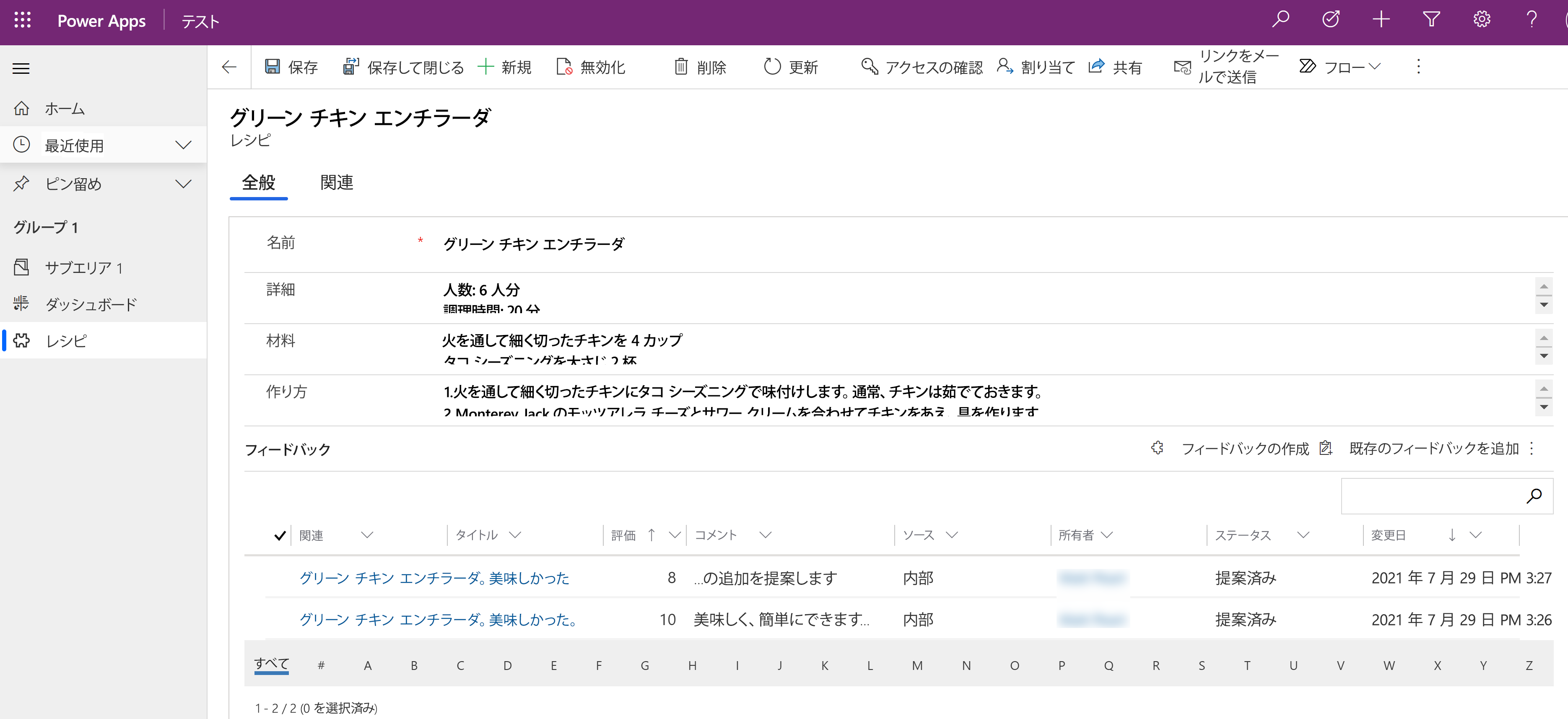 - ソース。 レシピ (またはフィードバック サブグリッドがあるテーブル)