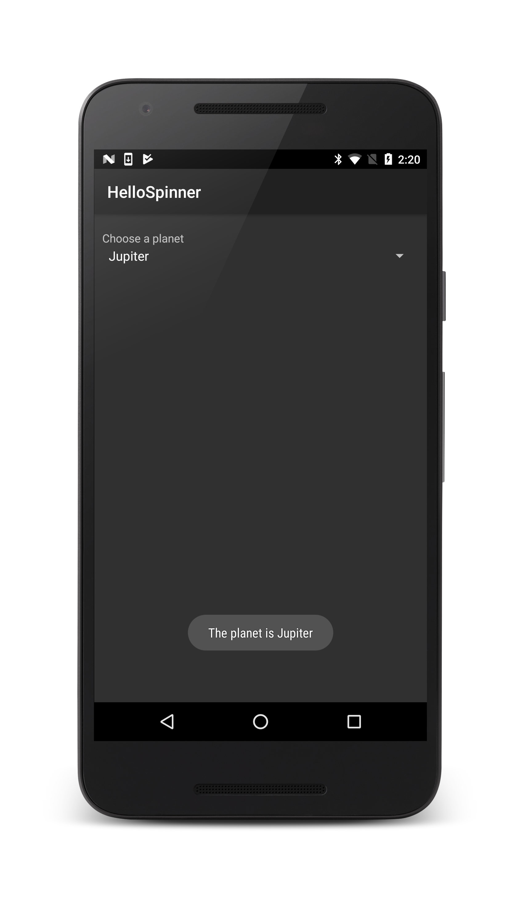 このチュートリアルの最初の部分では、惑星のリストを表示する単純なスピナー ウィジェットを作成します。 惑星を選択すると、選択した項目がトースト メッセージに表示されます。
