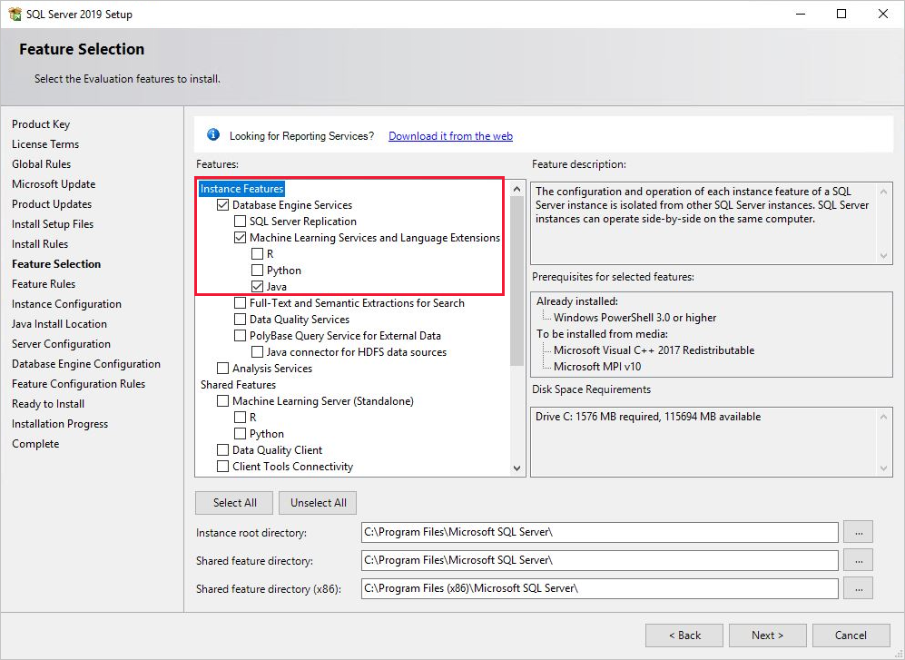 デフォルトの Java ランタイムをインストールする場合は、[Machine Learning Services および言語の拡張] と [Java] の両方を選択します。
