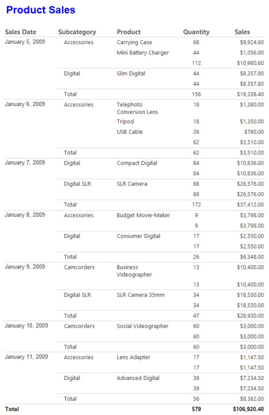 SalesDate 列の値が日付 (月、日、年) としてのみ表示されるようにします。 レポートの例を次に示します。