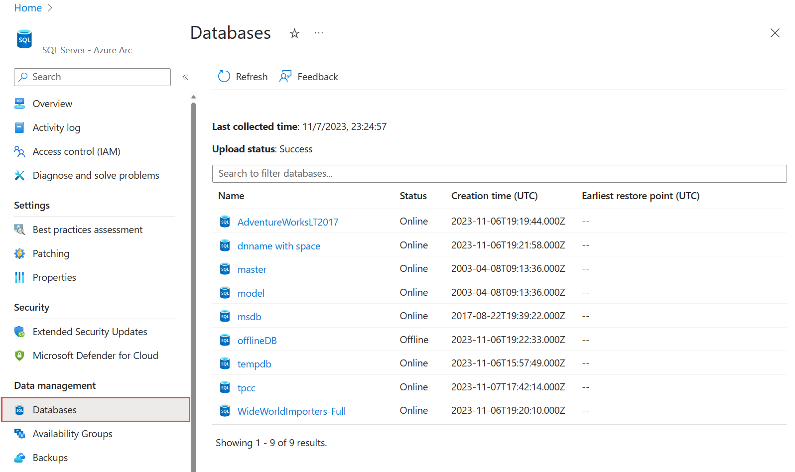 - SQL Server データベース -Azure Arc 領域を使用して、インスタンスに属しているデータベースを表示します。