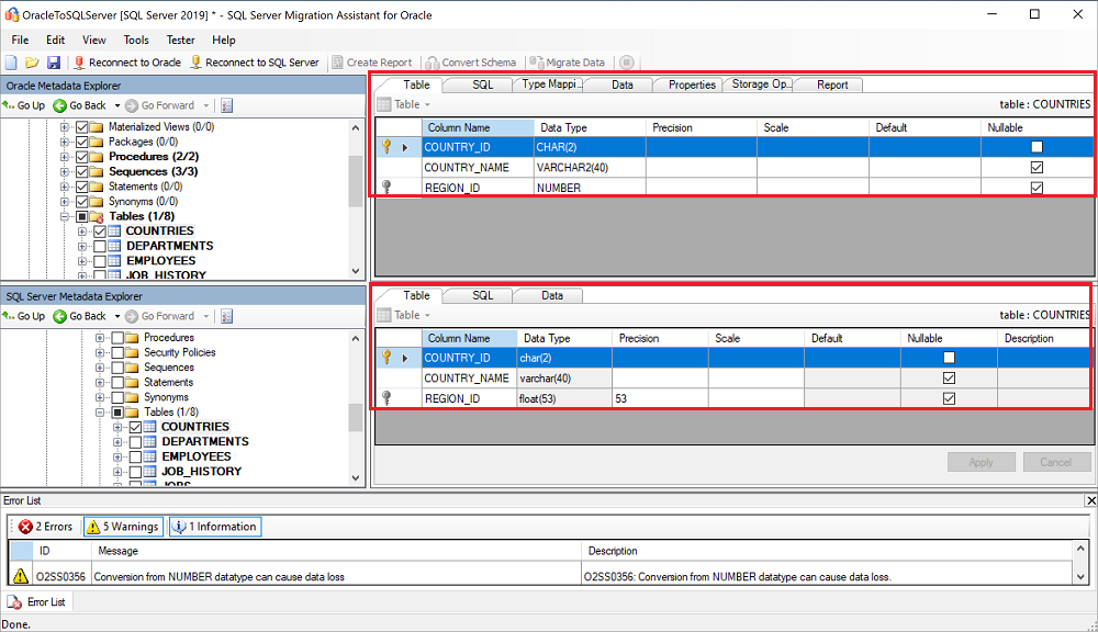 [Oracle メタデータ エクスプローラー] ペインでテーブル名を選択すると、各テーブルの型マッピングを変更できます。
