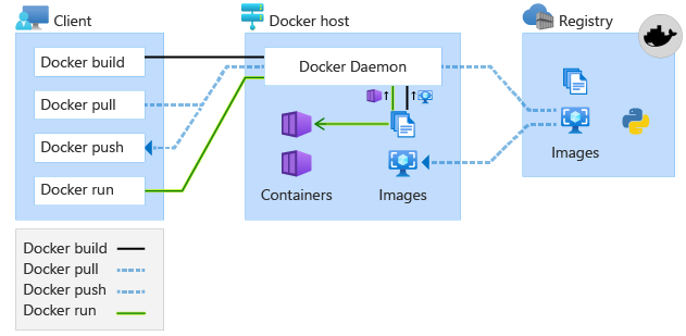 Docker ランタイムは、次の図に示すように、コンテナー イメージのビルド、プル、実行、プッシュに使用されます。