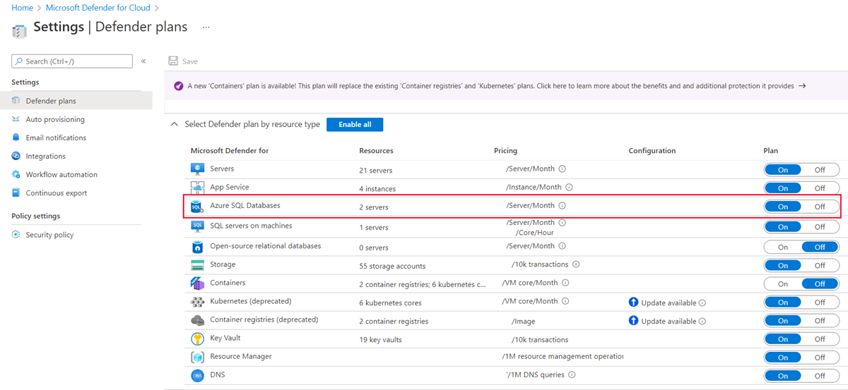 ![[Azure SQL Databases] プランが [オン] に設定された [Defender プラン] ペインを示すスクリーンショット。](media/azure-sql-database/defender-for-cloud-plans-azure-sql-database.png)