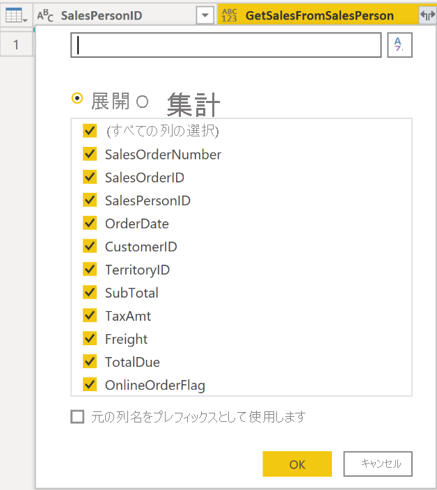 新しい列ヘッダーの 2 つの矢印アイコンを選択し、読み込む列のチェック ボックスをオンにします。 このセクションでは、各値 (販売担当者 ID) についてレポートで使用できる詳細情報を決定します。
