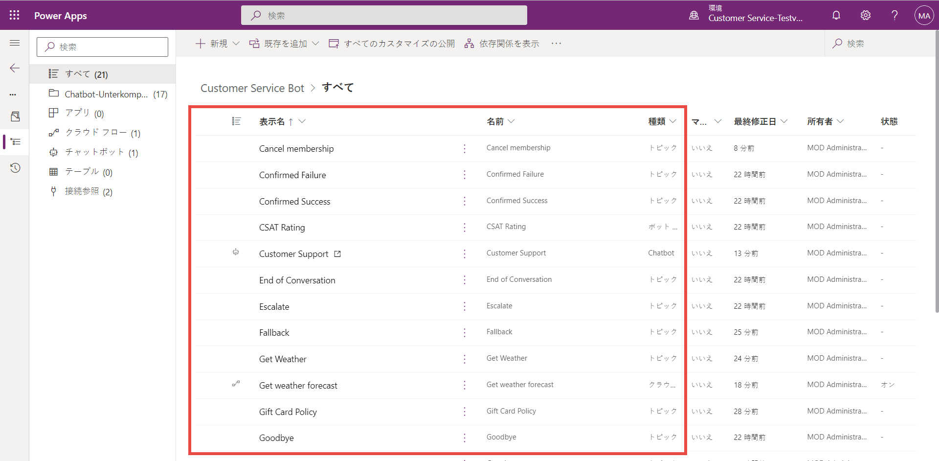 トピック、エンティティ、クラウド フローなど、エージェントのサブコンポーネントがソリューションに追加されます。 エクスポートが失敗する可能性があるため、Power Apps からエージェントのサブコンポーネントを削除したり、変更したりしないでください。
