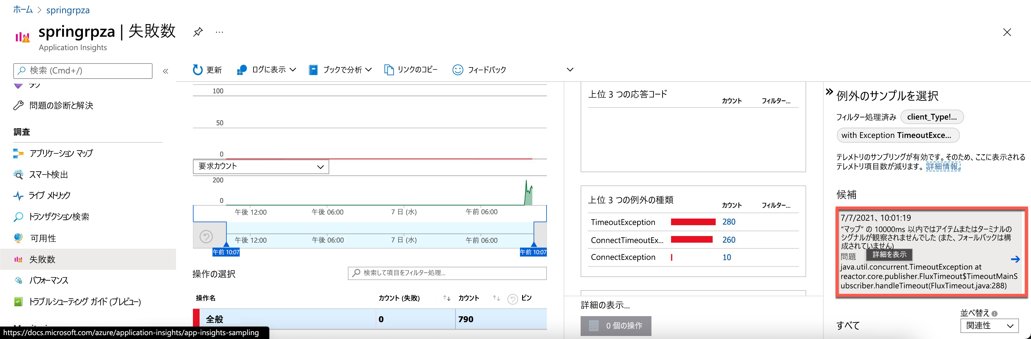 4. エンド ツー エンド トランザクションの詳細ウィンドウで例外プロパティを次に表示します。