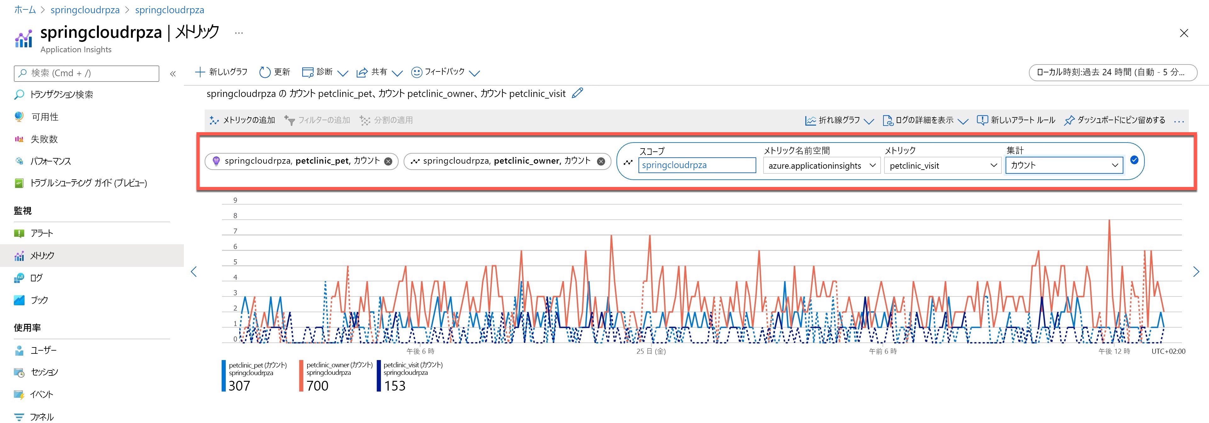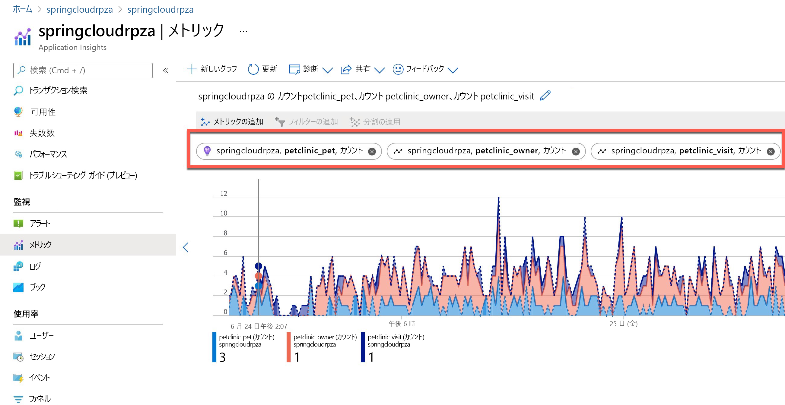 最終的なグラフには、pet、vet、および owner の各マイクロサービスについて、過去 24 時間のカウントが表示されます。