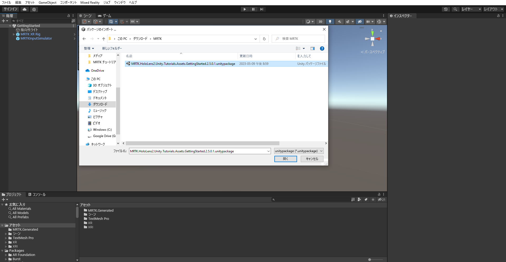パッケージをインポートで、ダウンロードしたMRTK.HoloLens2.Unity.Tutorials.Assets.GettingStarted.3.0.0 unitypackage を選択し、開くを選択します。