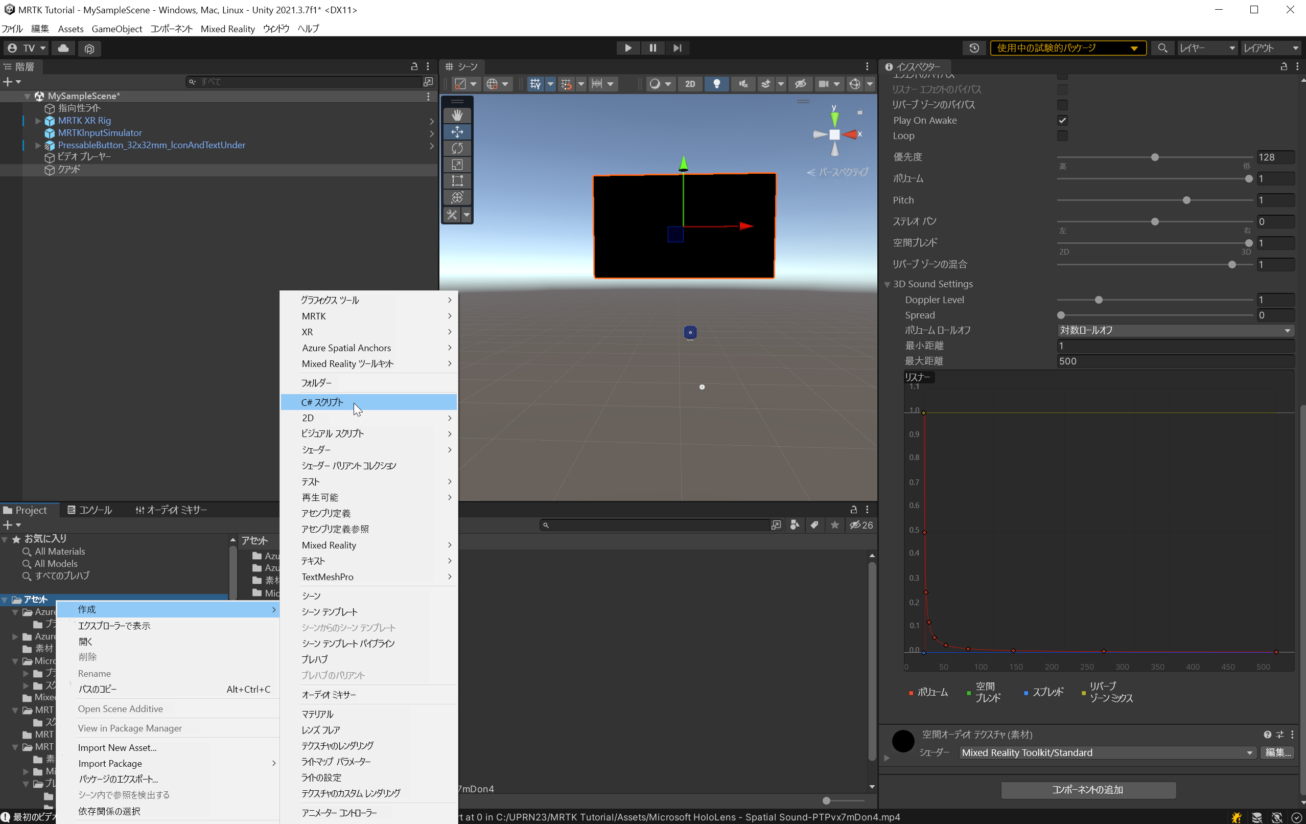 [プロジェクト] ウィンドウで右クリックし、[ 作成>C# スクリプト ] を選択して新しい C# スクリプトを作成します。 スクリプトに適した名前を入力します。たとえば、 SpatializeOnOff です。