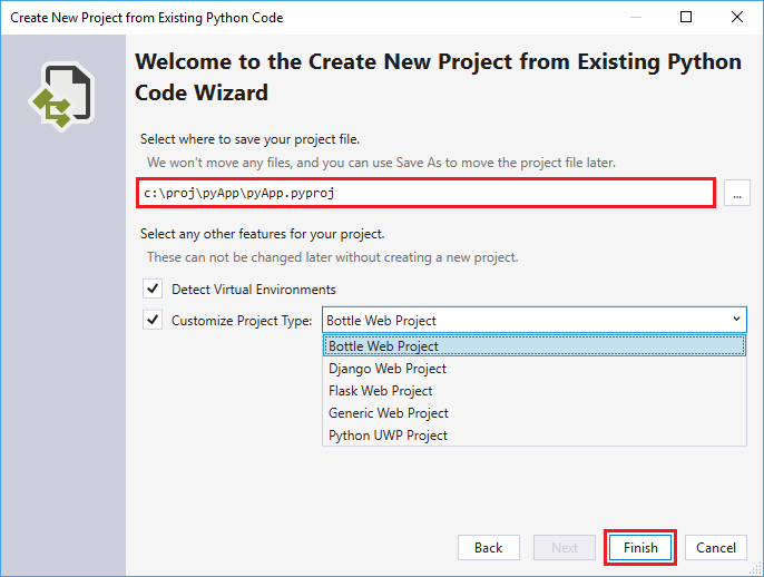 プロジェクト ファイル (ディスク上の .pyproj ファイル) を格納する場所を選択します。 該当する場合は、仮想環境の自動検出を含め、さまざまな Web フレームワーク用にプロジェクトをカスタマイズすることもできます。 これらのオプションがわからない場合は、フィールドを既定値のままにします。