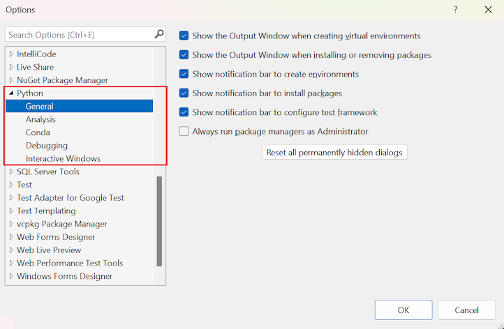 Tools>Options>Python では、対話型 Windows、conda 環境、デバッグなど、一般的な環境に Python 固有のオプションを設定できます。
