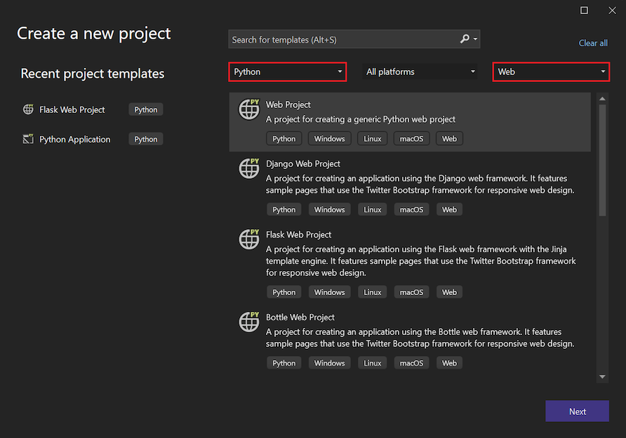 テンプレートからプロジェクトを作成するには、ツール バー メニューから [ファイル>新規作成>プロジェクト ] を選択します。 [ 新しいプロジェクトの作成 ] ダイアログで、テンプレートの一覧をフィルター処理して、Python Web プロジェクトで使用できるオプションを表示できます。 [検索] ボックスにキー用語を入力するか、フィルター ドロップダウン メニューを使用して言語として Python を選択し、プロジェクトの種類として Web を選択します。
