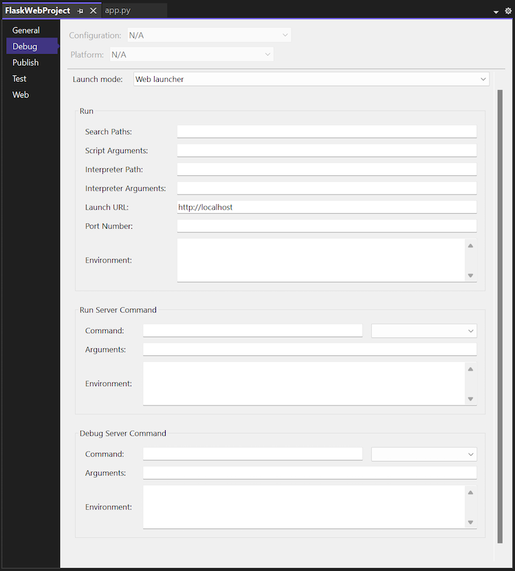 [サーバー コマンドの実行] グループと [サーバー コマンドのデバッグ] グループのプロパティによって、Web サーバーの起動方法が決まります。 多くのフレームワークでは、現在のプロジェクトの外部でスクリプトを使用する必要があるため、ここでスクリプトを構成でき、スタートアップ モジュールの名前をパラメーターとして渡すことができます。
