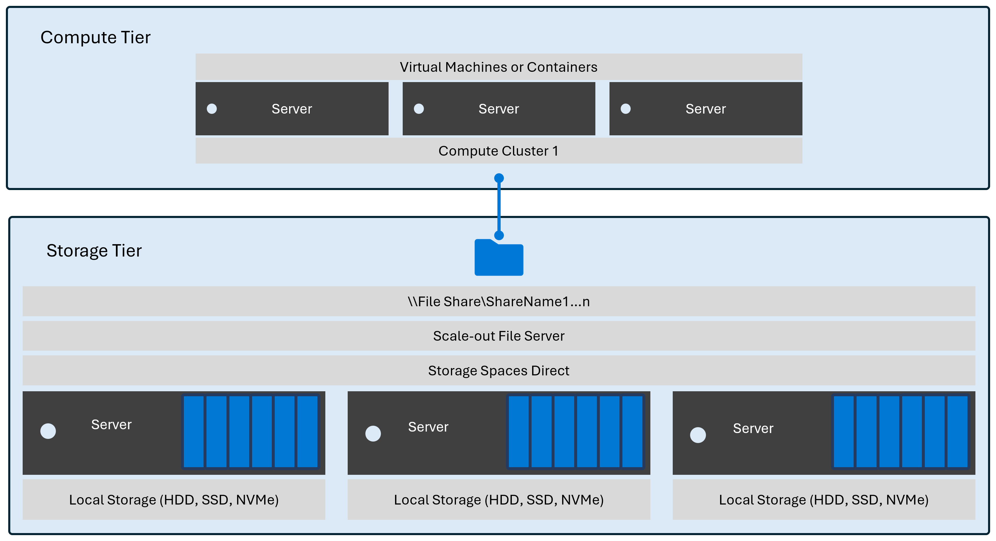 非集約記憶域スペース ダイレクトは、コンピューティングと記憶域を個別のクラスターに分割します。 コンピューティング クラスター (VM、Scale-Out ファイル サーバーの役割、SQL Server データベース、コンテナー化されたアプリケーションなどのワークロードを実行している) は、SMB 3.0 経由で別の記憶域スペース ダイレクト クラスターによって提供される記憶域にアクセスします。
