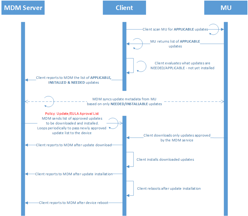 MDM では、OMA DM を介して更新プログラムを管理できます。 MDM を使用して Windows OMA DM プロトコルと統合する方法と、MDM 管理用にデバイスを登録する方法の詳細については、「 モバイル デバイス管理」を参照してください。 このセクションでは、更新プログラムの管理をサポートするためにその統合を拡張する方法について説明します。 更新管理の主な側面には、次の情報が含まれます。