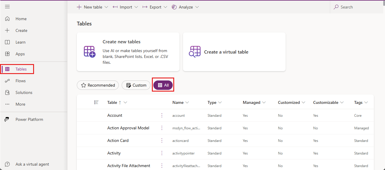 Selecteer in het deelvenster aan de zijkant de optie Tabellen en selecteer vervolgens Alles.