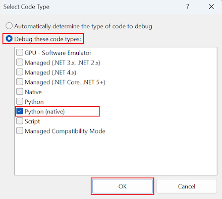U kunt naast of in plaats van de optie Systeemeigen ook andere codetypen selecteren. Als een beheerde toepassing bijvoorbeeld als host fungeert voor CPython, die op zijn beurt systeemeigen extensiemodules gebruikt en u fouten wilt opsporen in alle drie codeprojecten, schakelt u de selectievakjes Python, Systeemeigen en Beheerd in. Deze benadering biedt u een uniforme foutopsporingservaring, waaronder gecombineerde aanroepstacks en stappen tussen alle drie de runtimes.