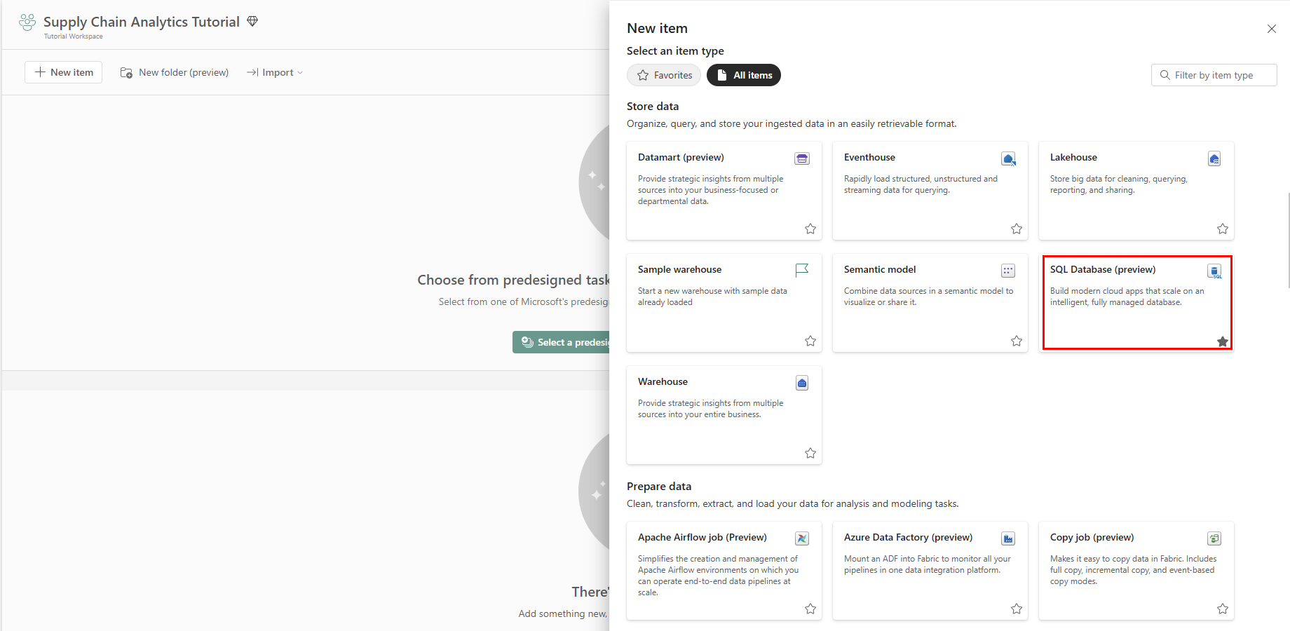 Agora que você tem um workspace, pode criar seu primeiro banco de dados SQL, um dos tipos que você pode criar no Banco de Dados do Fabric.