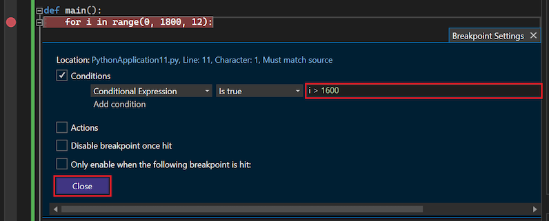 Percorrer centenas de iterações de um loop pode ser entediante, portanto, o Visual Studio permite adicionar uma condição a um ponto de interrupção. Quando você define uma condição de ponto de interrupção, o Depurador pausa o programa no ponto de interrupção somente quando a condição é atendida.