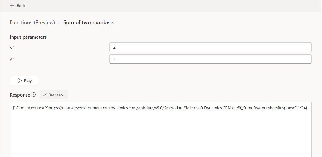 - Forneça valores para os parâmetros de entrada definidos na função e, em seguida, selecione Reproduzir.