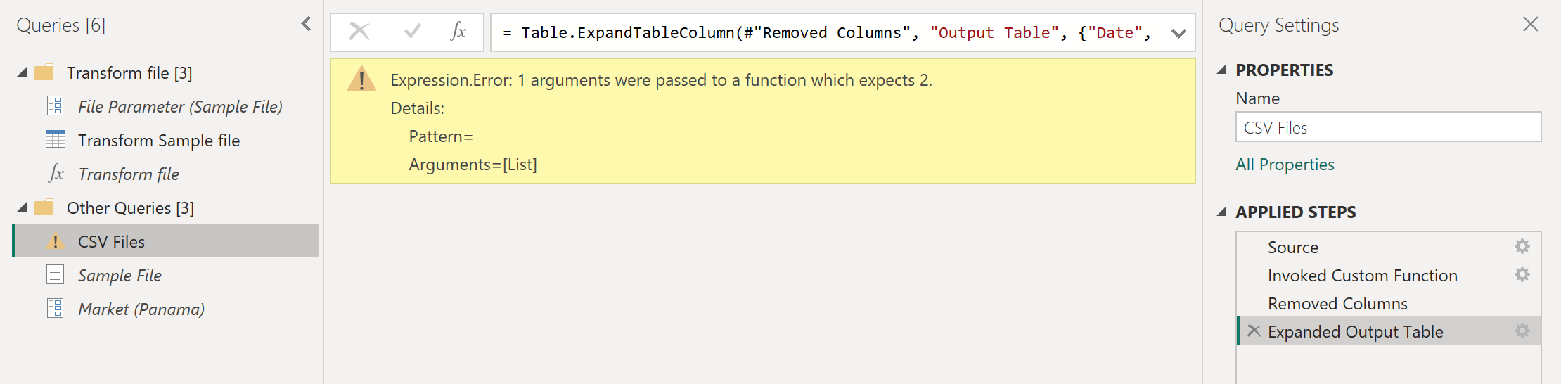 Mas o arquivos CSV consulta tem um sinal de aviso ao lado. Agora que sua função está atualizada, ela requer dois parâmetros. Portanto, a etapa em que se invoca a função resulta em valores de erro, já que apenas um dos argumentos foi passado para a função Transform arquivo durante a etapa Função personalizada invocada.