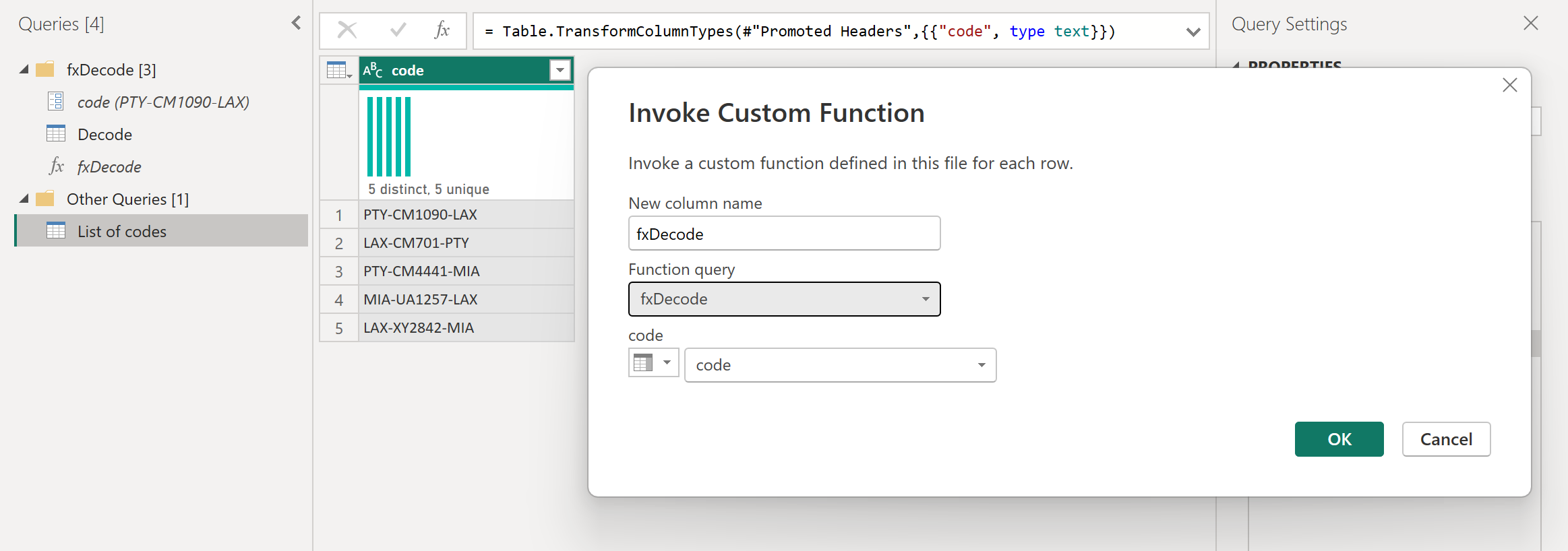 A partir desse parâmetro, você cria uma nova consulta onde aplica as transformações necessárias. Para este caso, você deseja dividir o código PTY-CM1090-LAX em vários componentes: