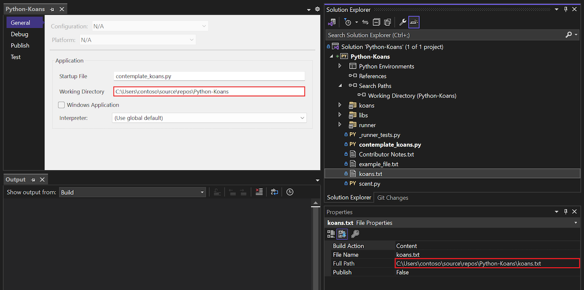 Uma forma rápida de confirmar a localização da pasta dos ficheiros clonados é verificar as propriedades do ficheiro clonado no Explorador de Soluções. Clique com o botão direito no ficheirokoans.txt e selecione Propriedades para abrir o painel de detalhes no Explorador de Soluções. No painel de detalhes, repare que a localização da pasta do ficheiro está listada na propriedade Caminho Completo . Pode colar este valor no campo Diretório de Trabalho na página de Propriedades do projeto.
