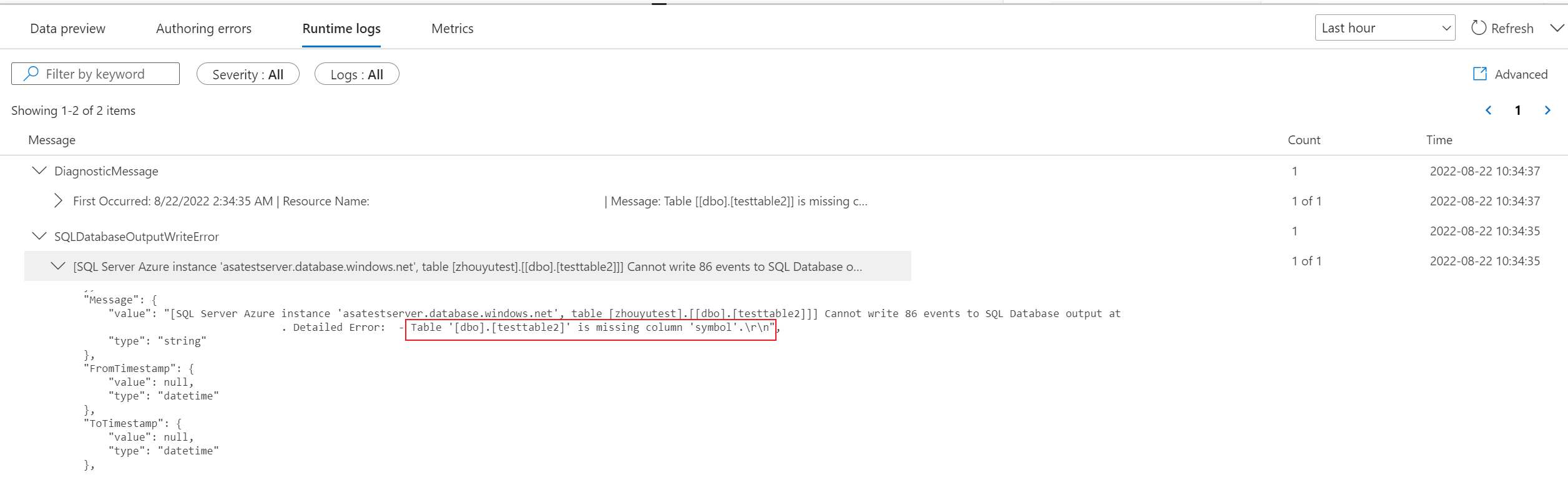 I följande skärmbildsexempel har användaren konfigurerat SQL Database-utdata med ett tabellschema som inte matchar fälten i jobbutdata.