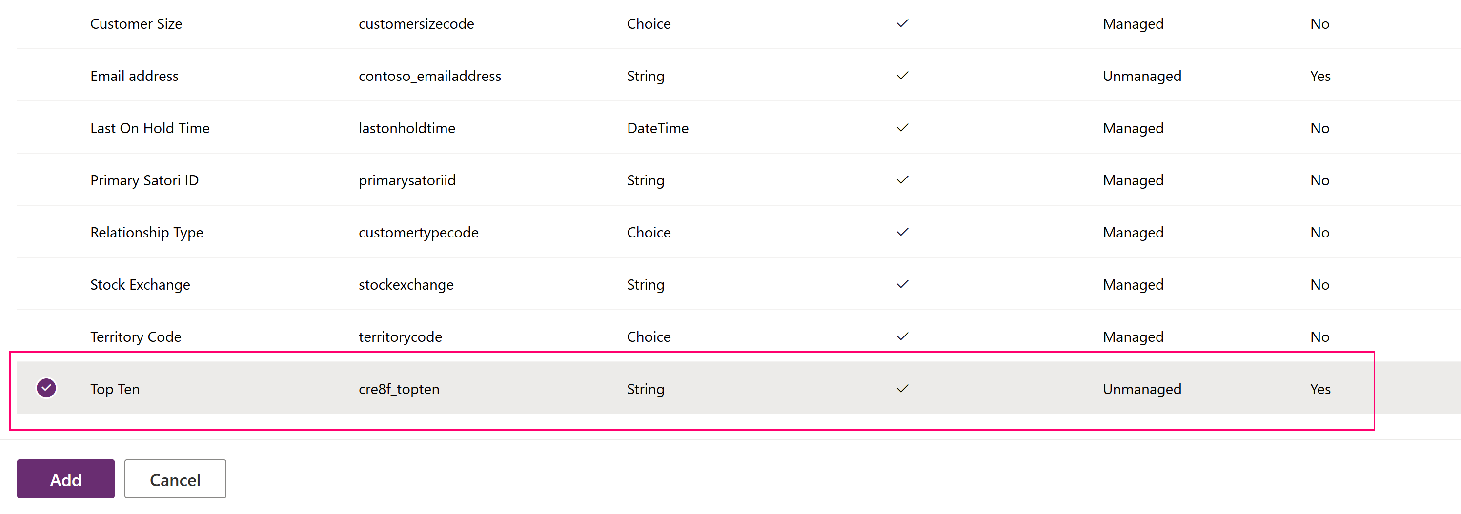6. Om du har valt Redigera objekt öppnas ett objektlistfönster. Här kan du välja de specifika objekt som du vill inkludera i lösningen. I vårt exempel valde du tabellen Konto tidigare, så nu väljer du kolumnen Översta tio eftersom det är den enda nya eller redigerade komponenten för tabellen och väljer sedan Lägg till. Markera objekt som ska inkluderas i lösningen